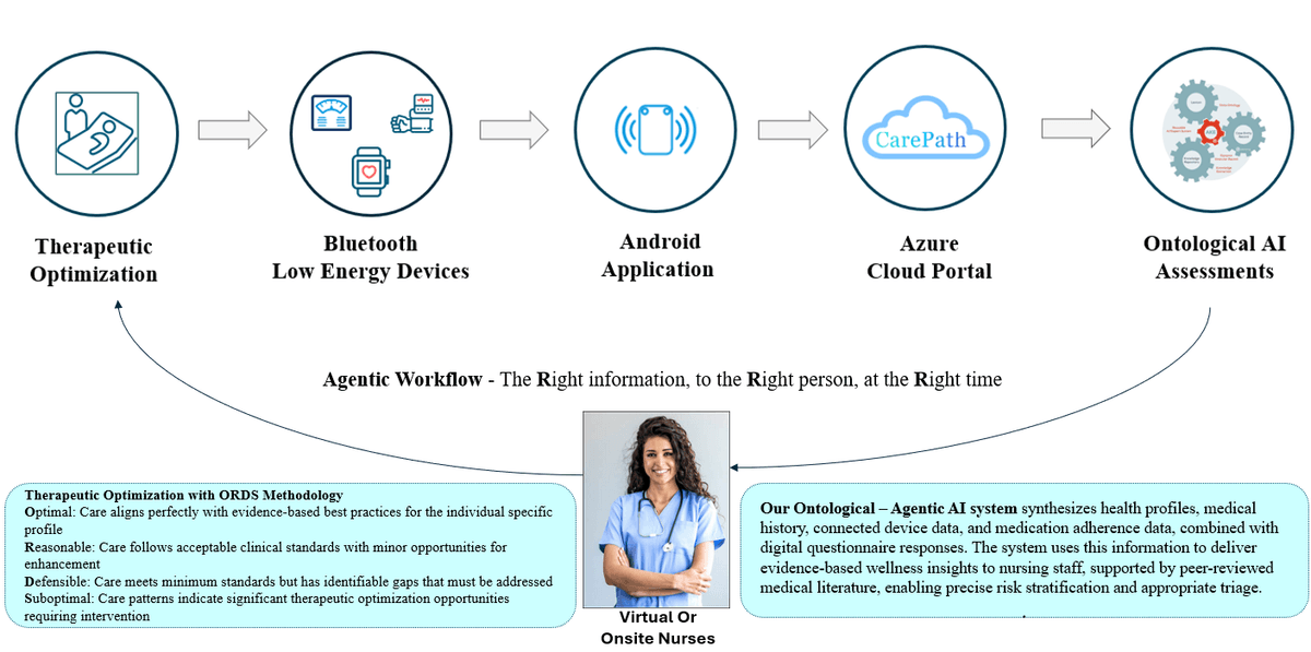 Our Agentic AI - Ontological solution synthesizes resident health profiles, medical history, connected device data, and medication adherence data, combined with digital questionnaire responses. The system uses this information to deliver evidence-based clinical insights to nursing staff, supported by peer-reviewed medical literature, enabling precise risk stratification and appropriate care escalation.