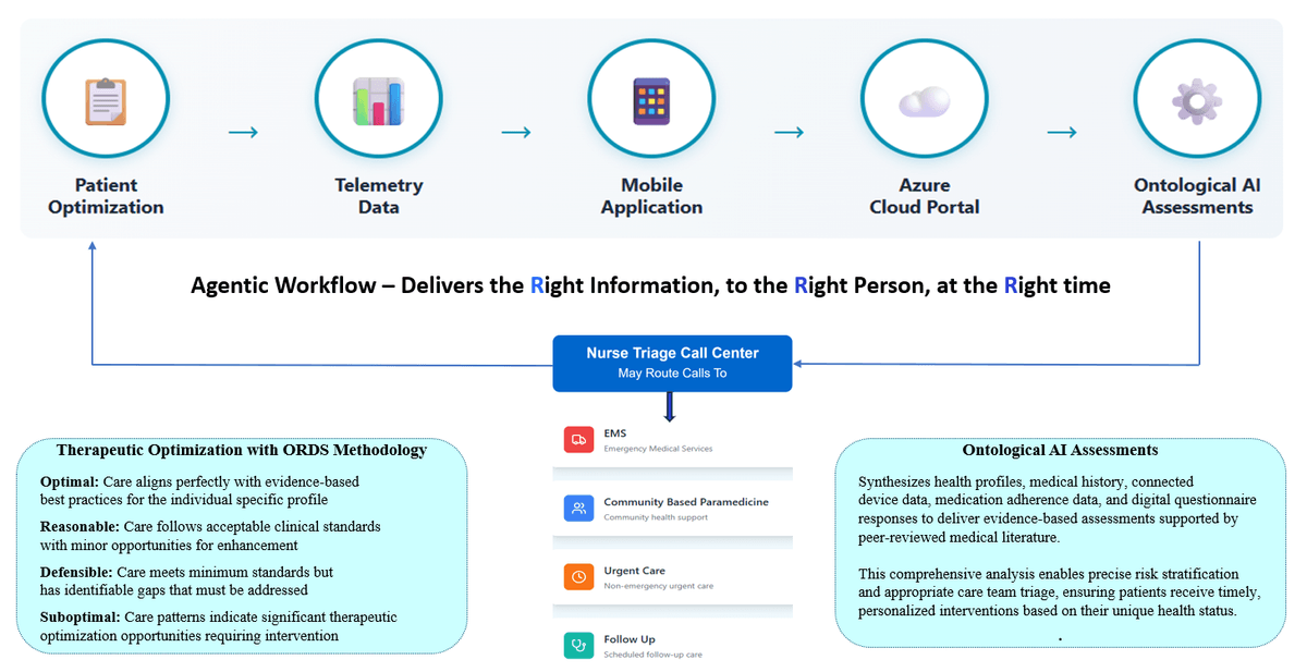 Our Ontological-Agentic AI system analyzes health profiles, medical history, connected device data, electronic questionairre responses and medication adherence patterns to identify opportunities for care optimization before conditions deteriorate.